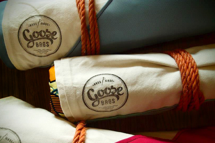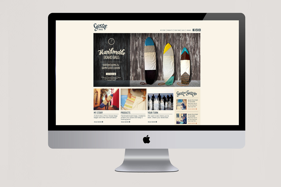 Goose Bags provide protective bags for surfboards, bodyboards and yoga mats. Made from vibrant fabric designs and lorry tarpaulin, a visual identity was needed to compliment the product range and an online presensce developed. www.goosebags.co.uk (Built by Koala Tea)