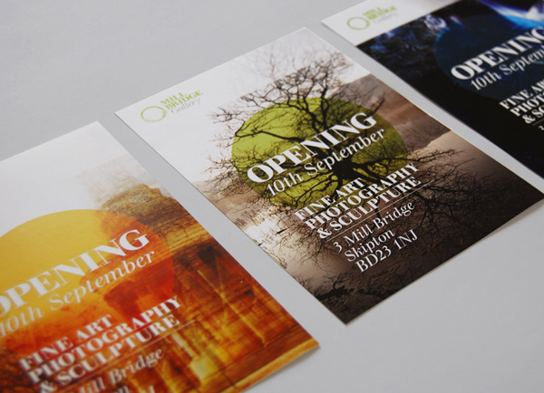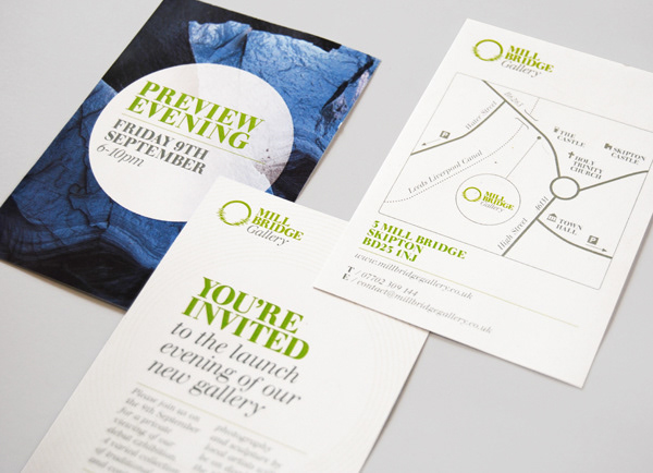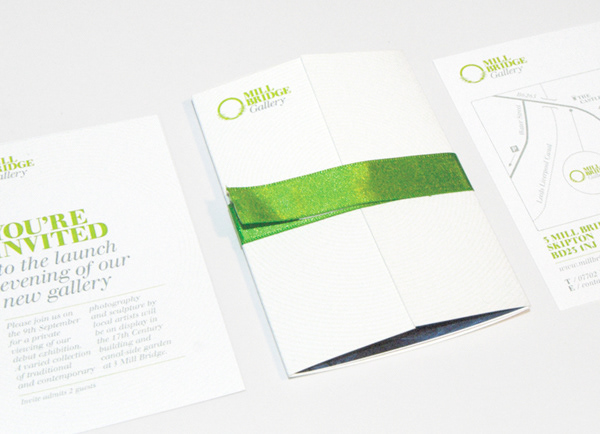 This recently opened Gallery, situated in Skipton is located in a canal-side building dating back to 1675, and showcases the work of local photographers and sculptors. I produced the branding for the gallery, and material for their launch night, including promotional flyers and posters, ribbon bound invitations and gift vouchers. The logo was engraved in wood for the main exterior sign, complimenting the heritage of the building. www.millbridgegallery.co.uk