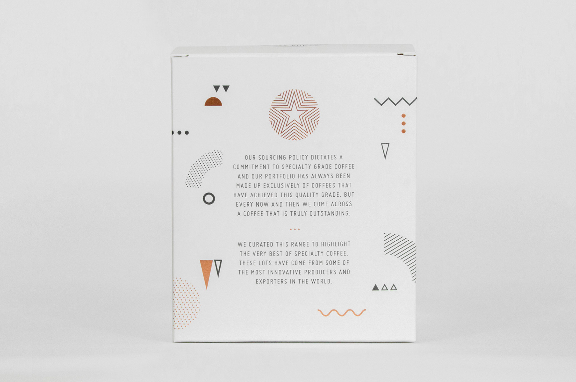 Packaging design for a speciality coffee range aimed at shining a spotlight on the very best of specialty coffee and also the environmental impact of the coffee industry. These coffees have come from some of the most innovative producers and exporters in the world and 50% of this packaging is made from the pulp of recycled cup fibre.