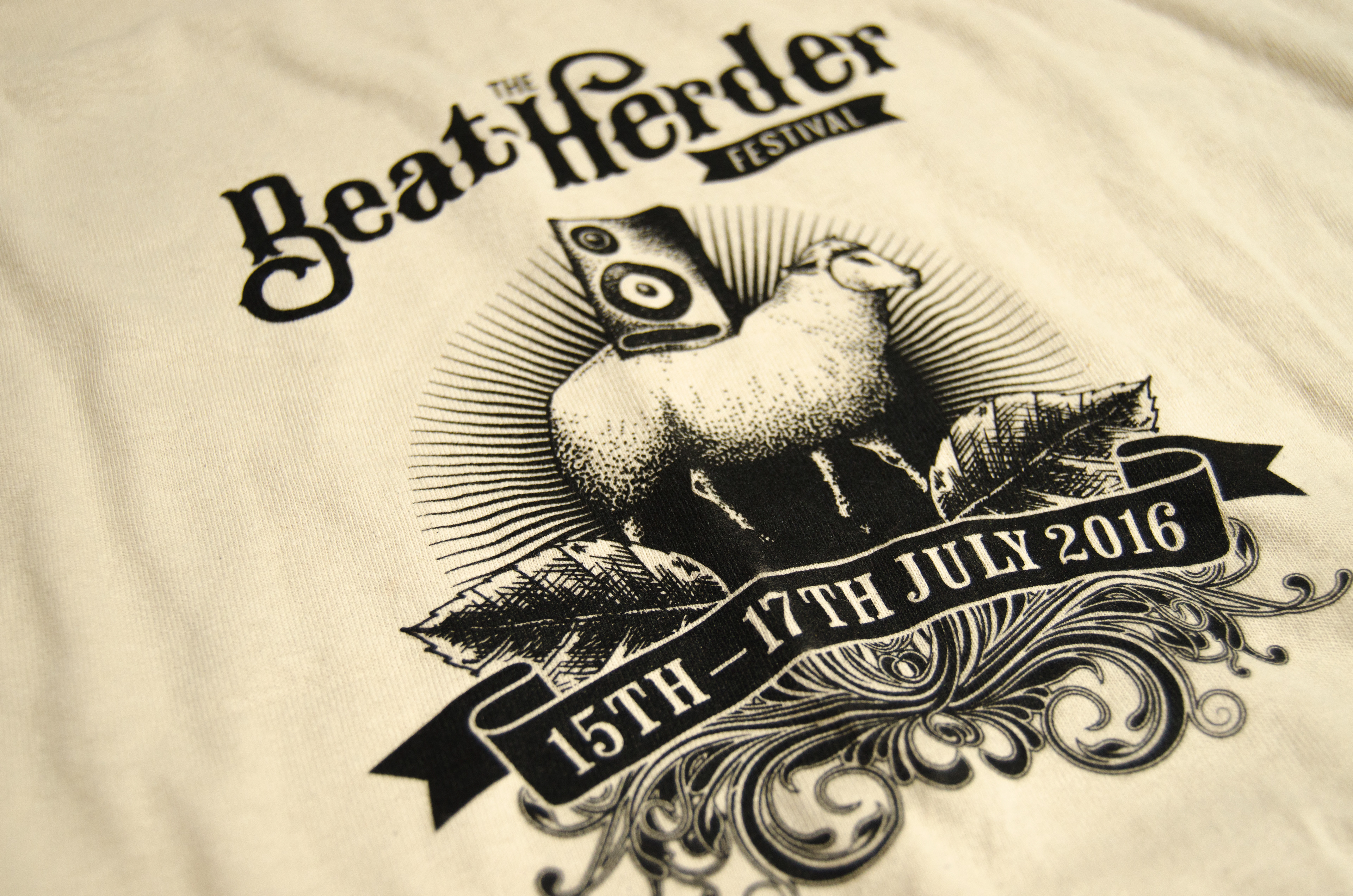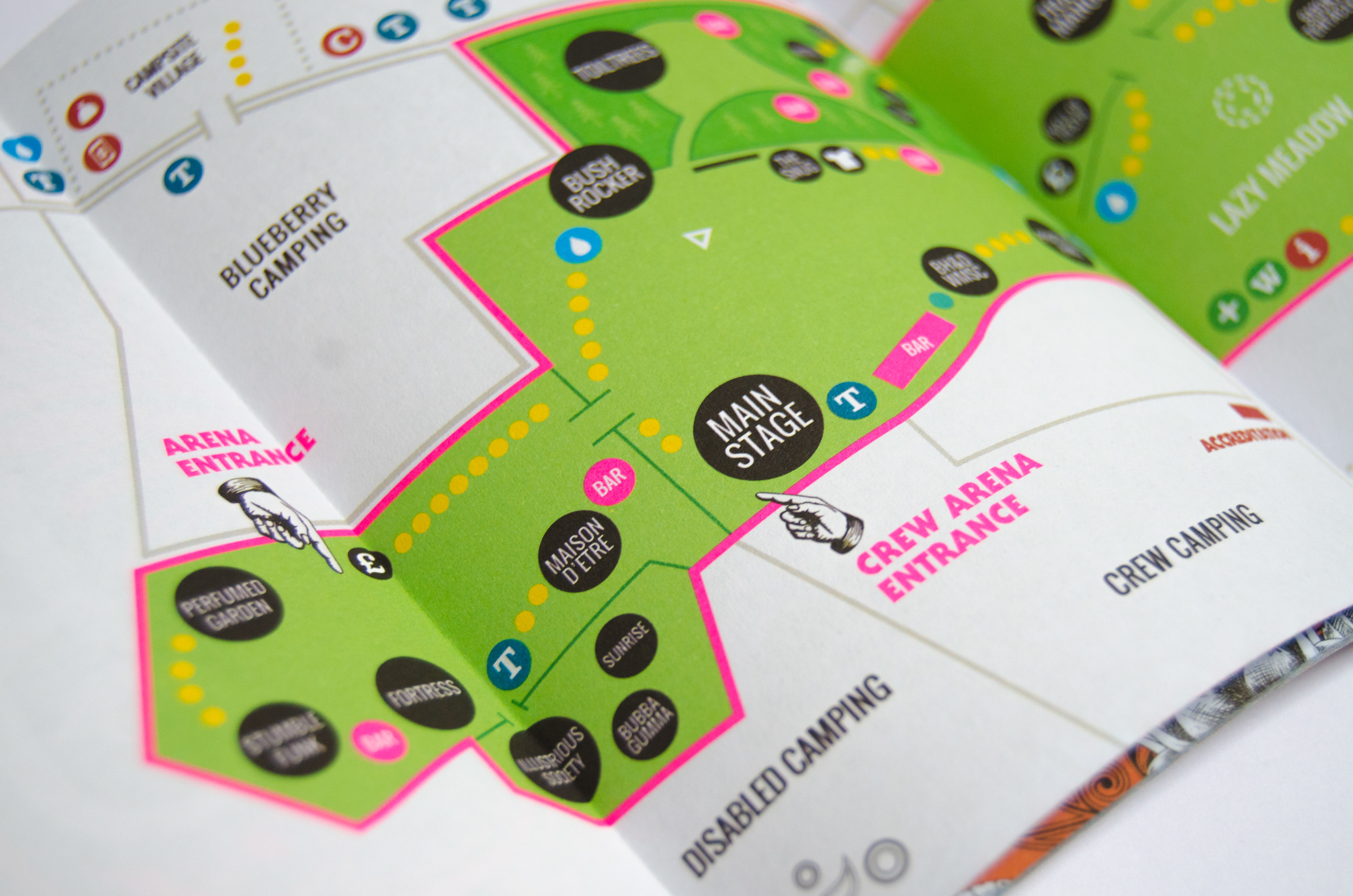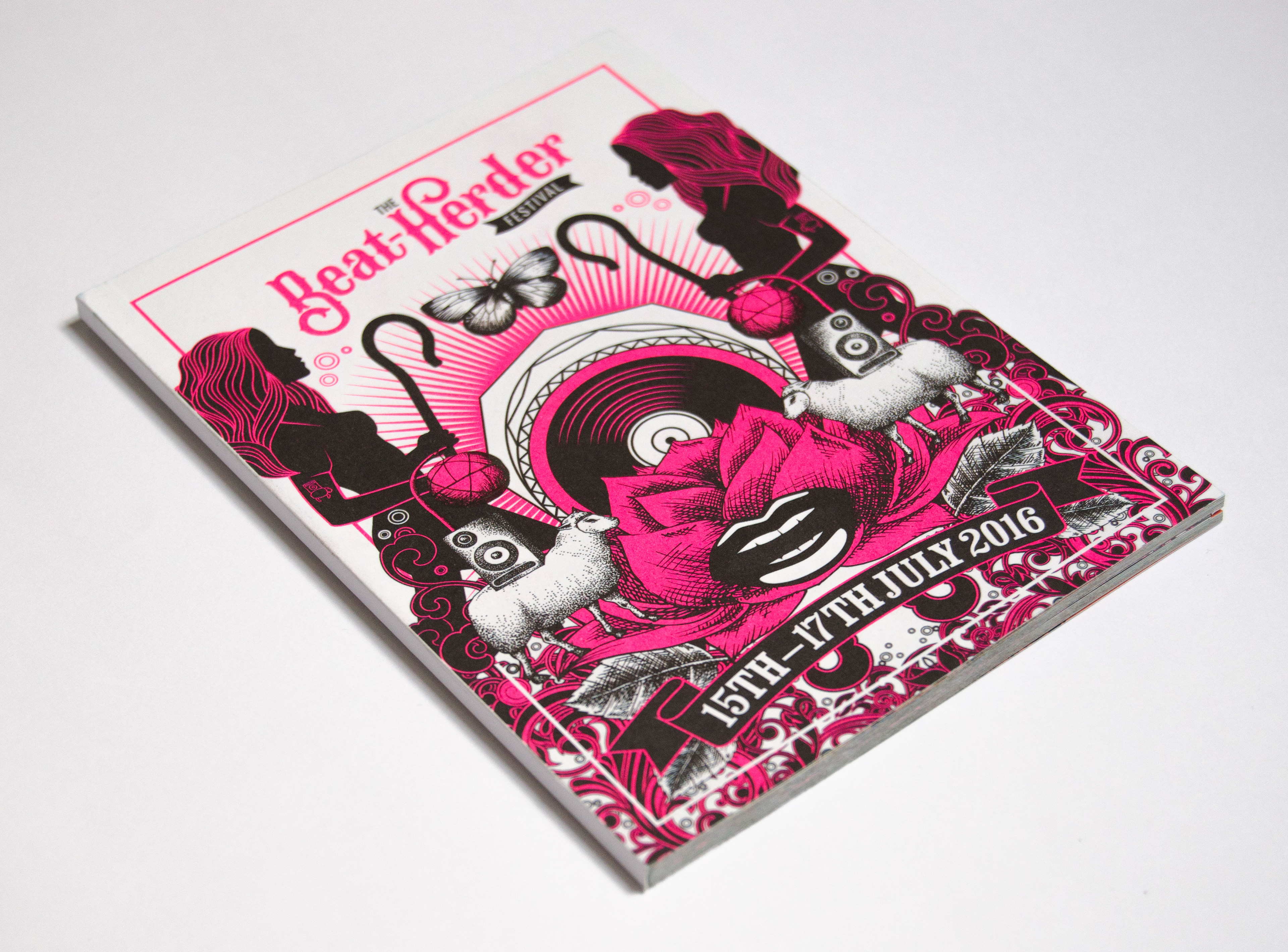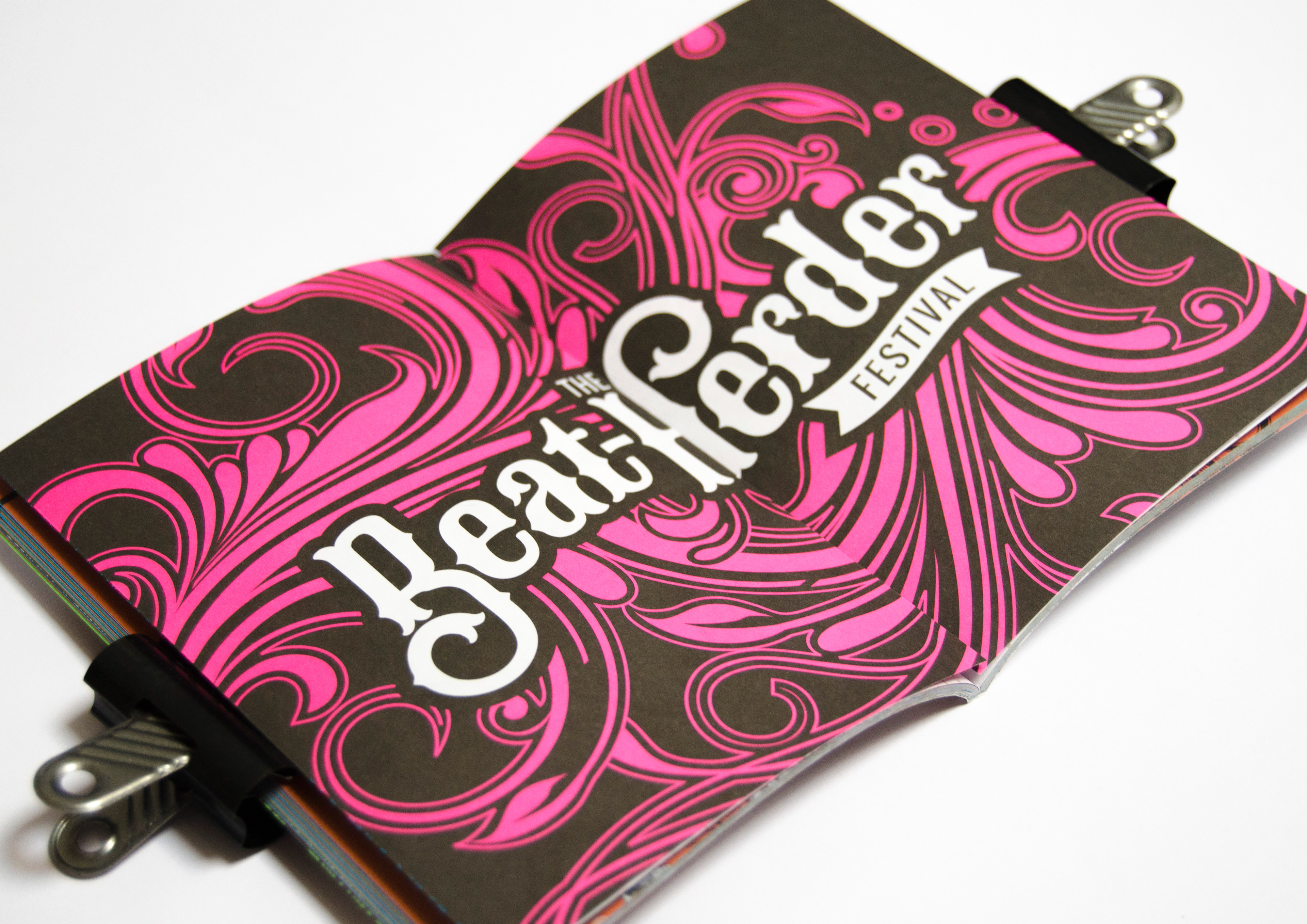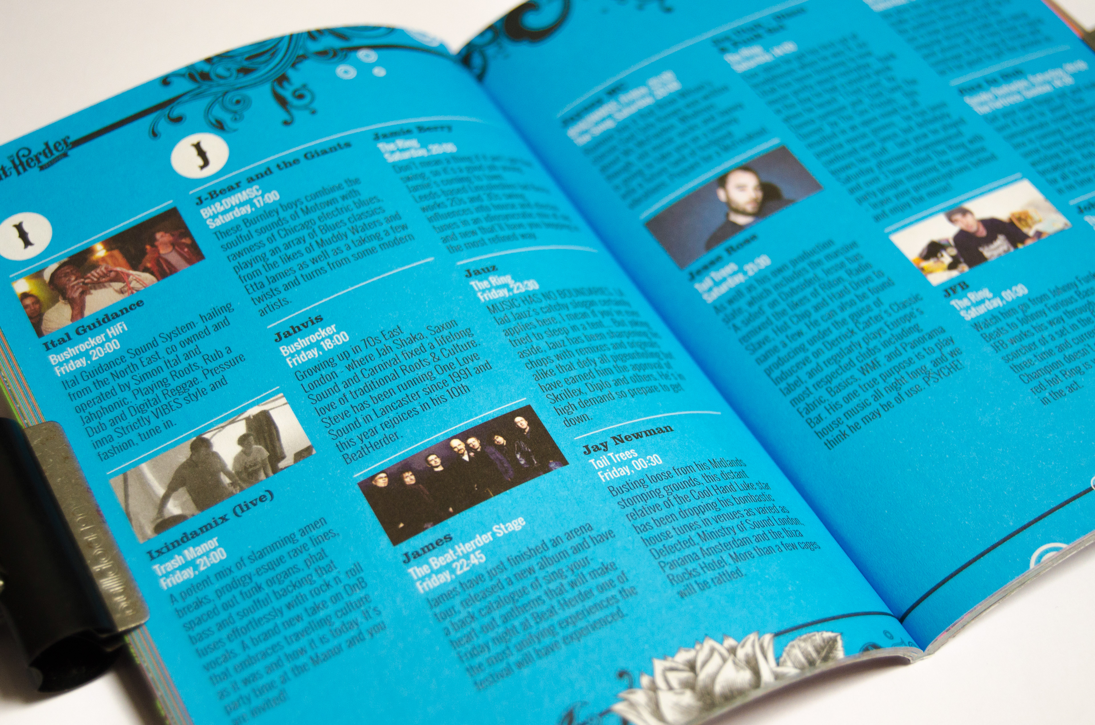 Programme and merchandise designs for the 11th Beat-Herder Festival. Fluorescent inks and a large foldout map helped make the information engaging, fun and clear to use.